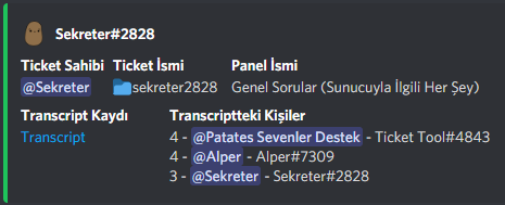 When the ticket is saved, it is sent to the 🎫transcript_log channel in embed form. If you wish, you can click on the Transcript text to view and examine the ticket in HTML form.